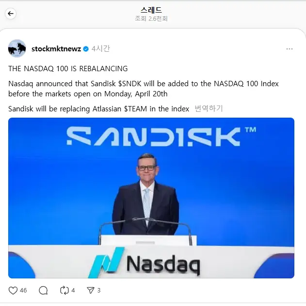 샌디스크는 2026년 4월 20일 장 시작 전 나스닥100 편입 예정이며, 기존 종목이던 아틀라시안은 지수에서 제외되는 흐름으로 확인되고 있습니다.